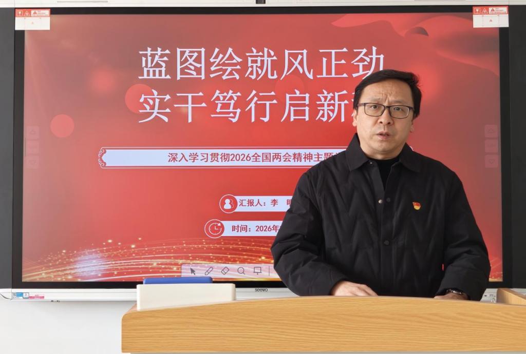 随后,党课立足“十五五”开局之年、紧扣2026年全国两会精神,党课围绕“回望来路、展望前程、立足岗位、勇担使命”四个维度展开深入学习。李明结合全国两会部署,解读了党的二十届四中全会审议通过的“十五五”规划建议,明确了 “十五五”时期的战略定位、首要任务及“三大强国”建设的战略部署。并立足学校发展实际,对全体党员干部提出明确要求:一是以强化政治引领为根本,把稳学校发展的“方向盘”;二是以深化改革创新为动力,激活学校发展的“新引擎”;三是以师生急难愁盼为靶心,彰显学校发展的“真温度”。他强调,学习贯彻两会精神的关键在于行动,要将党中央的决策部署转化为推动学校高质量发展的具体举措,切实解决师生最关心、最直接、最现实的问题。